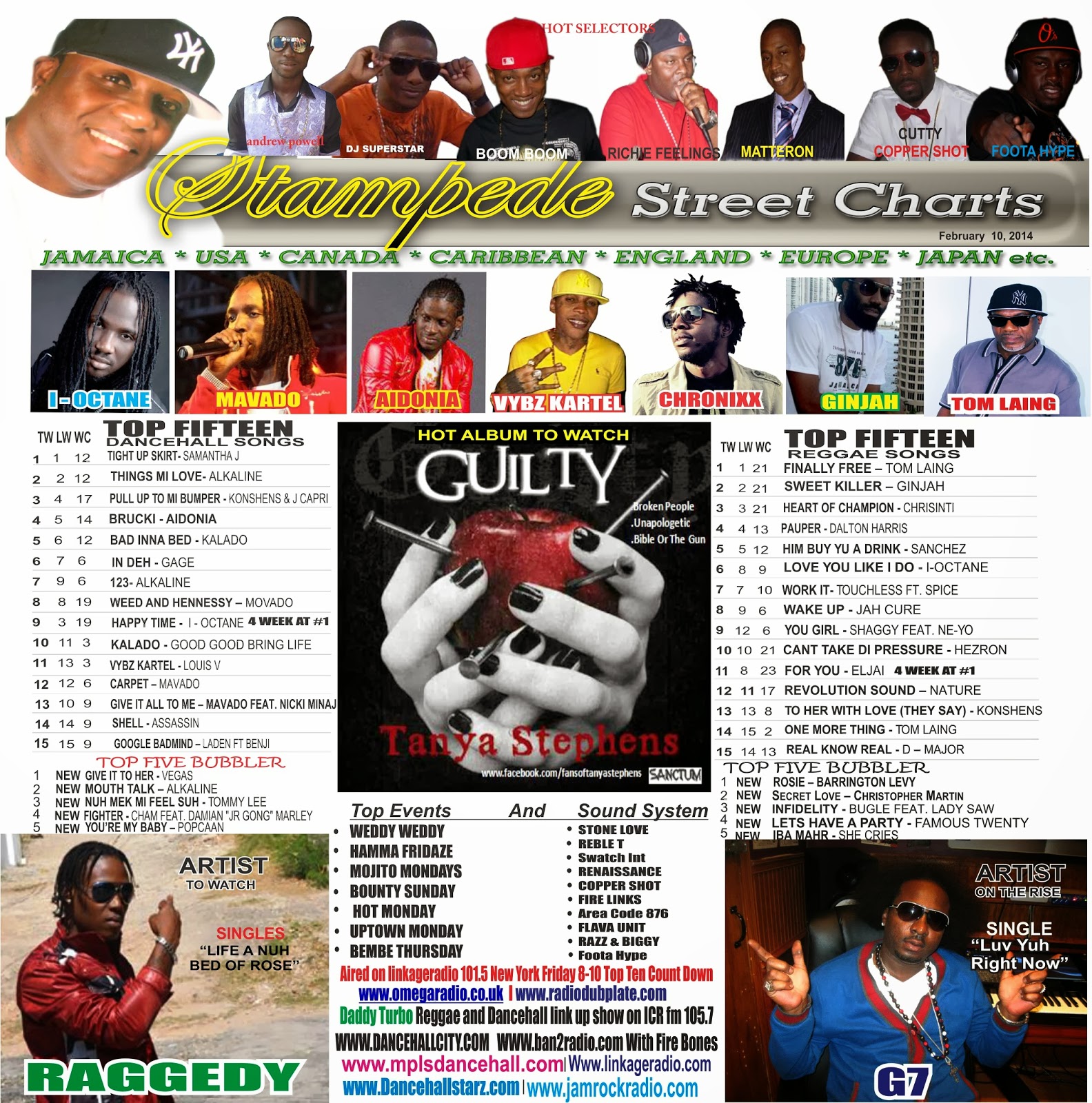 This week Street Charts roundup: Tanya Stephens featured with The Album To Watch. G7 featured As New Artiste To Watch, Raggedy Featured As New Artiste To Watch While Samantha J Remains At The Number One Dancehall Spot With The Hit Single ‘Tight Up Skirt’. Tom Laing Remains At The Number One Reggae Spot With The Hit Single ‘Finally Free’. Featured as Single Of The Week World Blast Premier G7- Luv U Right Now (official Raw Video+single) Prod. By Warrior Chief Productions.